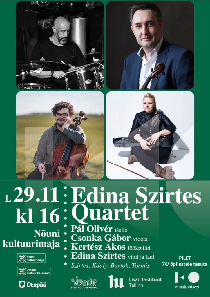Edina Szirtese keelpillikvartett- Ungari, Endre Kertész Endre – tšello, Gábor Csonka – viiul, Adonisz Fábry – löökpillid ja vioola, Edina Szirtes – viiul, laul. Kavas B.Bartoki, Z.Kadaly, V.Tormise ja E.Szirtese teosed ja seaded keelpillikvartetile. Kontserttuuri toetab Ungari Liszti-Instituut. Kontserdisari baseerub koostööle ning kaasrahastusele Helikunsti sihtkapitali, Valgamaa ekspertgrupi, Nõuni kultuurimaja ja Uus Kontsert OÜ poolt.