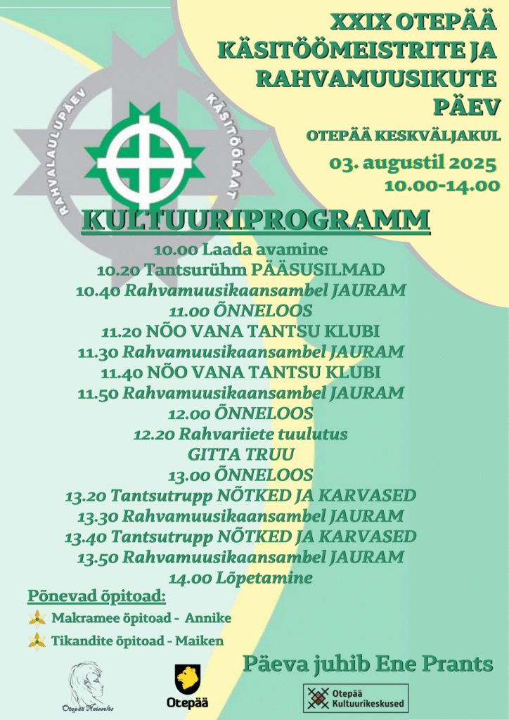 Pühapäeval, 03. augustil kell 10.00-14.00 toimub Otepää keskväljakul traditsiooniline KÄSITÖÖMEISTRITE JA RAHVAMUUSIKUTE PÄEV! KULTUURIPROGRAMM: 10.00 Laada avamine 10.20 Tantsurühm PÄÄSUSILMAD 10.40 Rahvamuusikaansambel JAURAM 11.00 ÕNNELOOS 11.20 NÕO VANA TANTSU KLUBI 11.30 Rahvamuusikaansambel JAURAM 11.40 NÕO VANA TANTSU KLUBI 11.50 Rahvamuusikaansambel JAURAM 12.00 ÕNNELOOS 12.20 Rahvariiete tuulutus GITTA TRUU 13.00 ÕNNELOOS 13.20 Tantsutrupp NÕTKED JA KARVASED […]