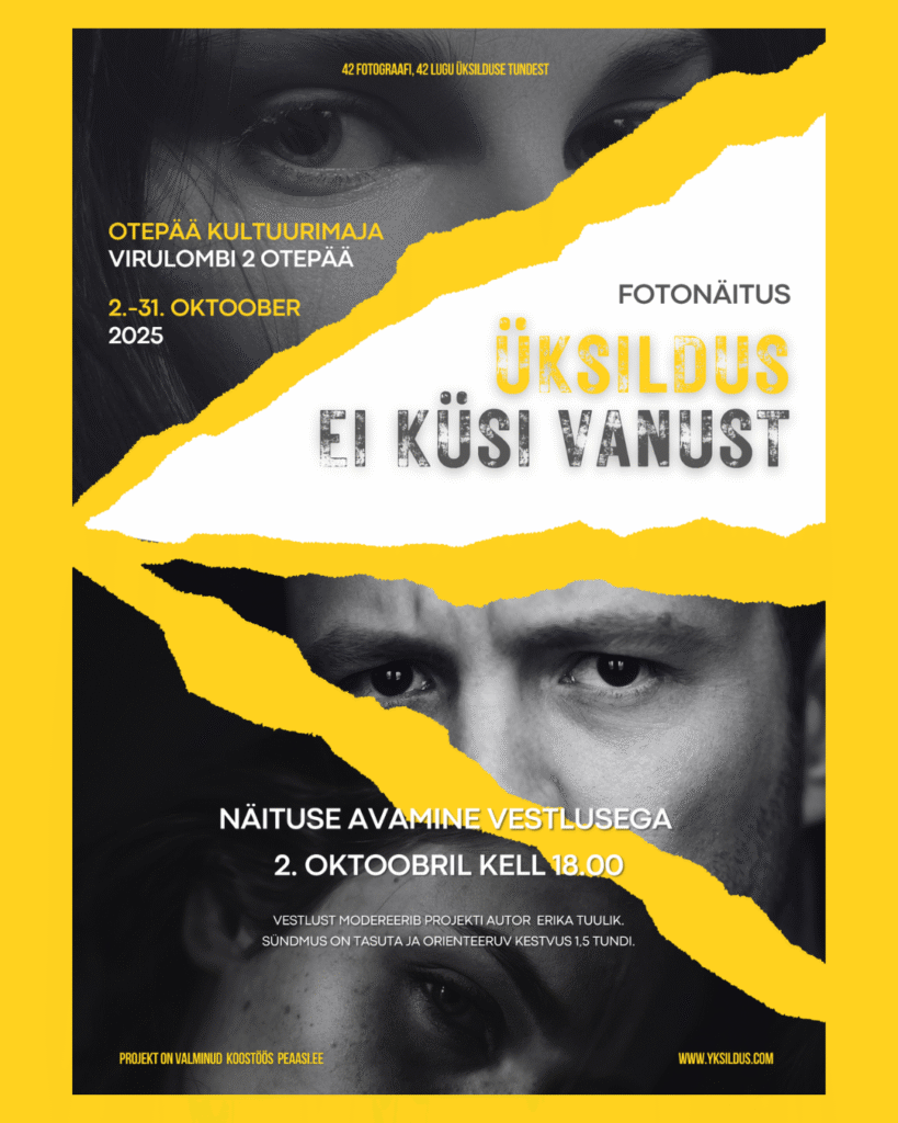 OKTOOBRIS 2025 RÄÄGIME ÜKSILDUSEST OTEPÄÄL! Avame näituse 2.oktoobril kell 18.00, mis läheb sujuvalt üle vestlusringiks, et hubases keskkonnas arutleda koos nii fotodest, projekti eesmärgist kui ka üksildusest.Vestlust modereerib projekti autor – Erika Tuulik Oktoober on vaimse tervise kuu ja miks mitte rääkida selle puhul üksilduse tundest, mis on tunne nagu iga teinegi. Teema millest rääkimise […]