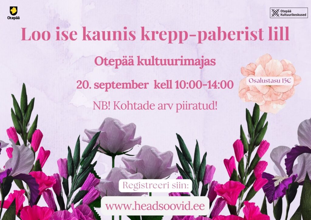 Tule veeda loov ja rõõmus päev, kus sinu käte all sünnivad kaunid gladioolid, iirised ja roosid krepp-paberist! See on ideaalne võimalus võtta aeg maha, nautida meisterdamist ja viia koju lillekimp, mis ei närtsi kunagi. Juhendaja: Merili Ahman – Head Soovid Kõik vajalikud töövahendid ja materjalid on kohapeal olemas. Hind: vaid 15 € Kohtade arv on […]