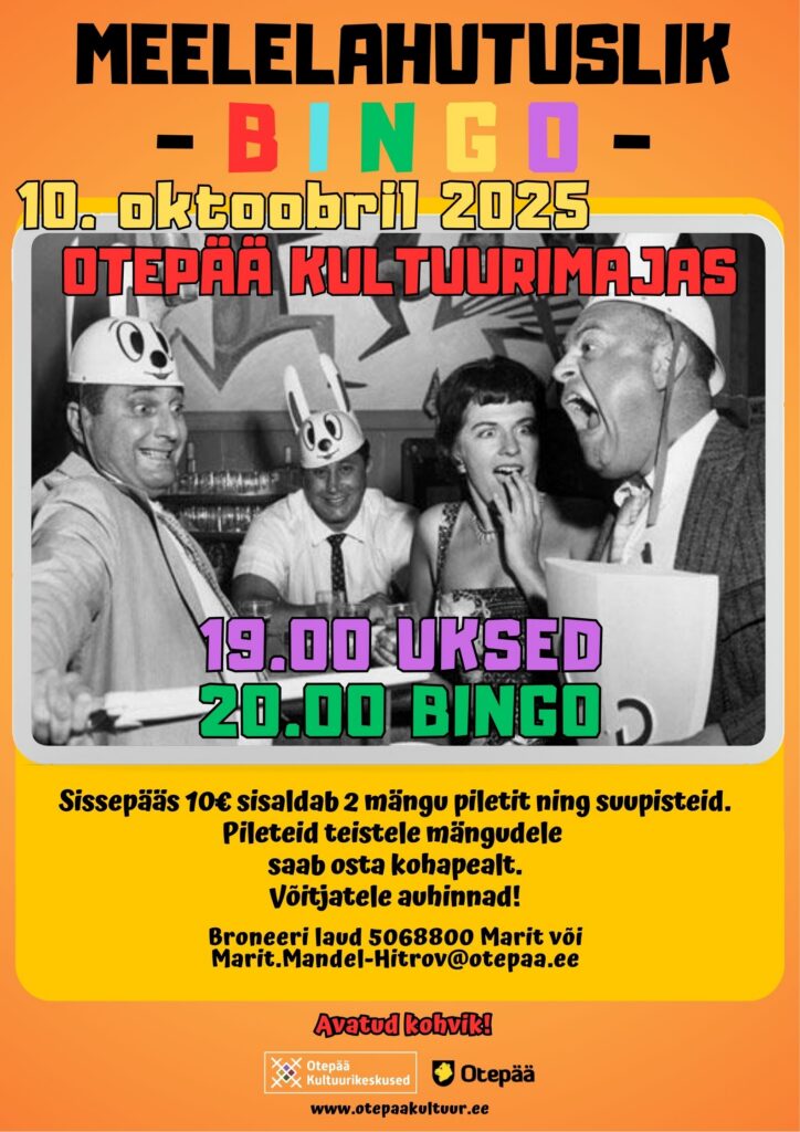Suur Bingoõhtu Otepääl! Pane kalendrisse kirja, et 10. oktoobril läheb meil tõeliseks BINGOTAMISEKS! Uksed avame kell 19.00 Suur mängumöll algab kell 20.00 Nagu alati, on üks mänguosa pühendatud heategevusele – kogutud summa läheb otse Otepää valla abivajajatele. Tule ja tee head, samal ajal lõbusalt aega veetes! Sissepääs: 10 € / inimene Hind sisaldab: – Piletid […]
