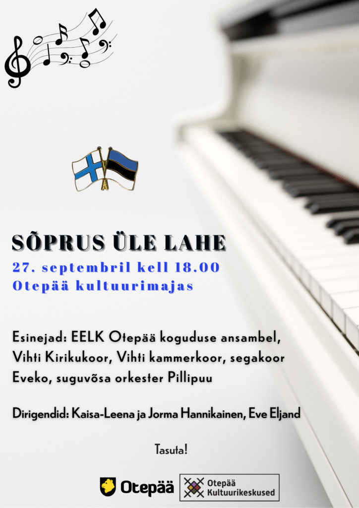 Kutsume teid Otepää ja Vihti sõpruskontserdile, mis põimib endas kokku kahe sõprusomavalitsuse läbi laulu ja mängu. Sõprus, mis sai alguse juba aastal 1989 ning vältab tänu muusikale ning kultuuri- ja kogudustevahelistele koostööprojektidele tänaseni. Esinejad: EELK Otepää koguduse ansambel, Vihti Kirikukoor, Vihti kammerkoor, segakoor Eveko ja suguvõsa orkester Pillipuu. Dirigendid: Kaisa-Leena ja Jorma Hannikainen, Eve Eljand […]