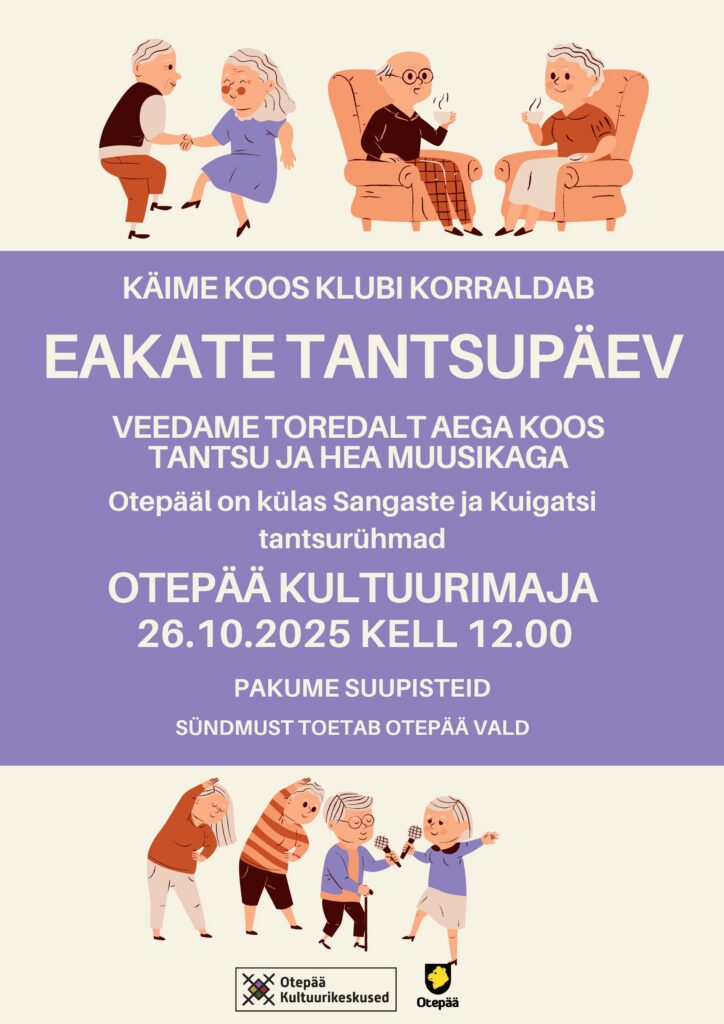 EAKATE TANTSUPÄEV Tule veeda üks rõõmus ja liigutav päev tantsu, hea muusika ja toreda seltskonnaga! 26. oktoobril 2026 kell 12.00 toimub Otepääl Eakate tantsupäev, kuhu ootame kõiki tantsulembeseid eakaid lähedalt ja kaugemalt. Külalised laval ja tantsupõrandal: Sangaste tantsurühm Kuigatsi tantsurühm Kohalikud tantsusõbrad Kohapeal pakutakse suupisteid ja jooki – keha saab tantsust sooja ja kõht jääb ka rõõmsaks! Sündmust […]