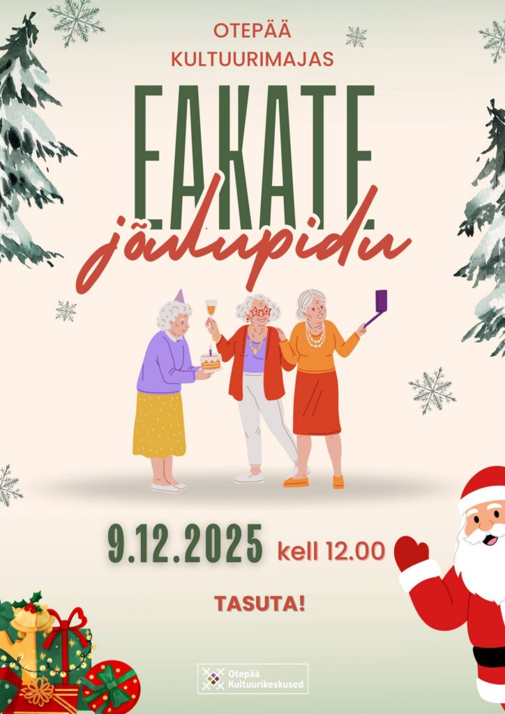 Eakate jõulupidu Otepää kultuurimajas On aeg tulla kokku, nautida jõuluaega ja veeta üks rõõmus päev heas seltskonnas! Ootame kõiki eakaid 9. detsembril kell 12.00 Otepää kultuurimajja, et tähistada jõule muusika, naeru ja jõulumeeleoluga. Võta kaasa hea tuju ja sõber ning tule veeda üks tore jõulueelne päev! Jaga infot ka oma vanavanematega. Sündmus on tasuta!