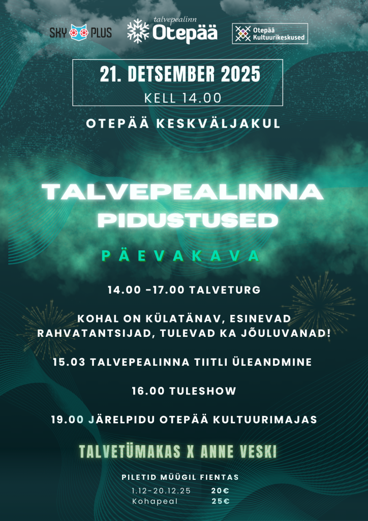 Otepää saab taas talvepealinnaks! Tule 21.detsembril kell 14.00 Otepää keskväljakule ja võta talv koos meiega vastu! Talvepealinna tiitli vastuvõtmise kava 21.12.2025 kell 14.00 – 17.00 talvepealinnak Otepää keskväljakul. Traditsiooniline talveturg, Otepää Külade Ühenduse Külatänav. Lisaks saab platsil näha ja proovida: Euroopa Saunamaraton programmi saun; kahevõistluse MK etapi esindajad on kohal MARU hüppemäega; IBU laskesuustamise MK […]