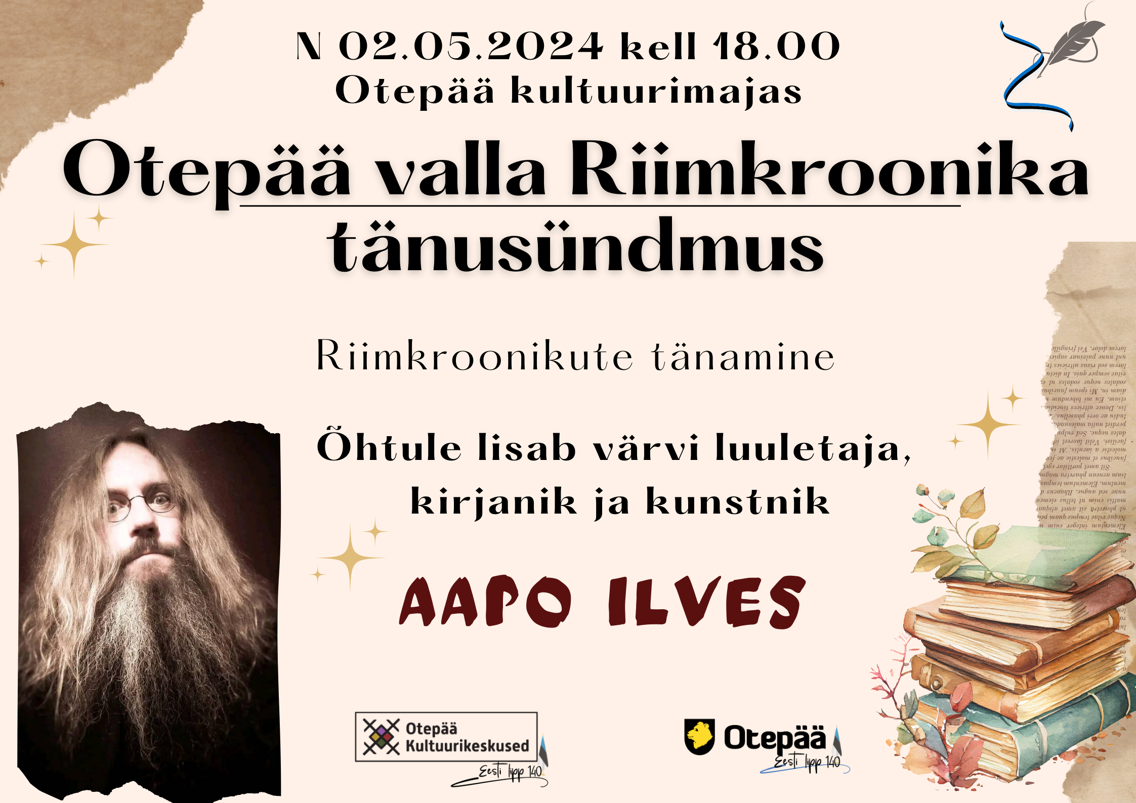 02.05.2024 kell 18.00 saavad Otepää kultuurimajas tänatud selleaastased riimkroonikud ning avalikustatud Otepää valla RIIMKROONIKA konkursi võistlustööd.