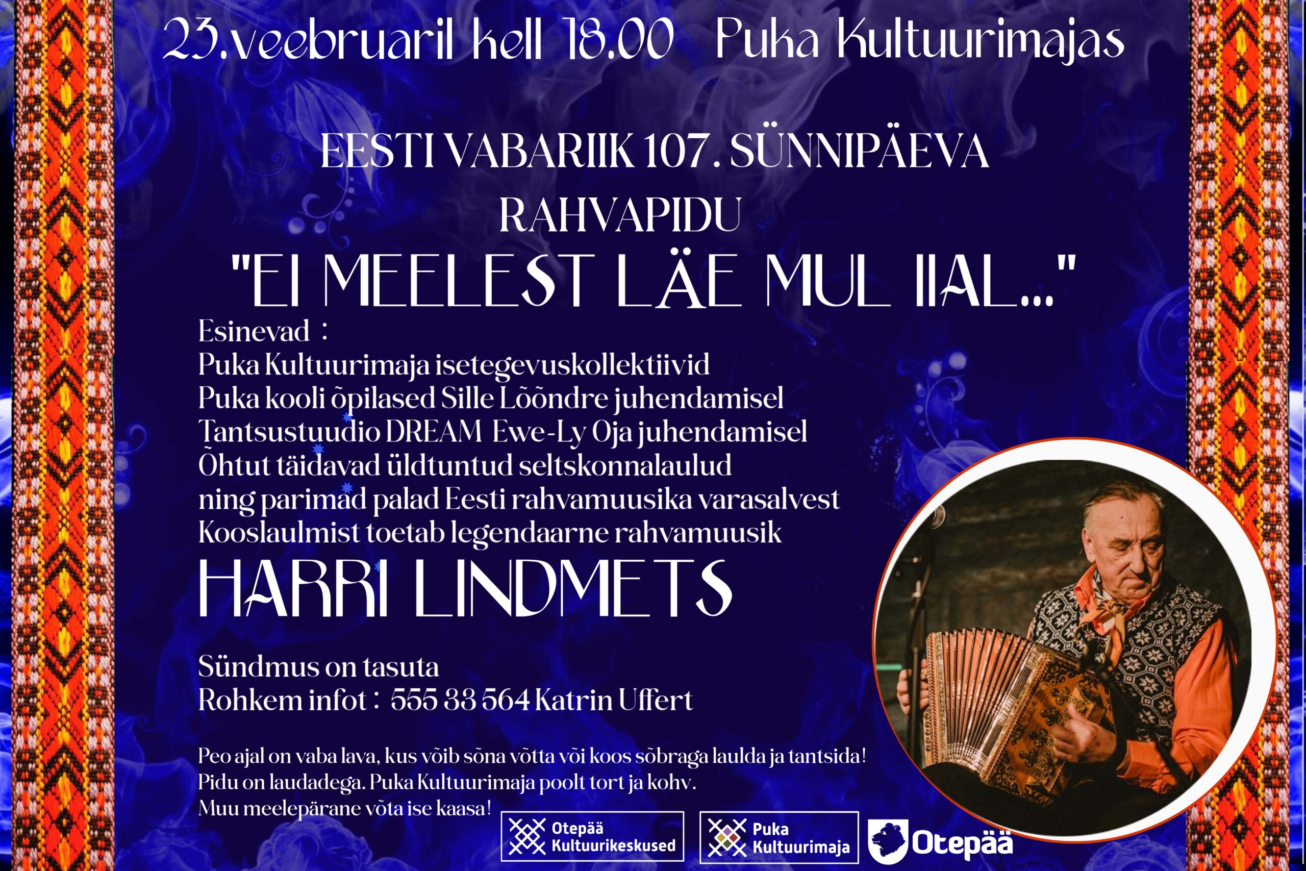 Pühapäeval 23. veebruaril kell 18.00 toimub EV 107. sünnipäeva rahvapidu “EI MEELEST LÄE MUL IIAL..”