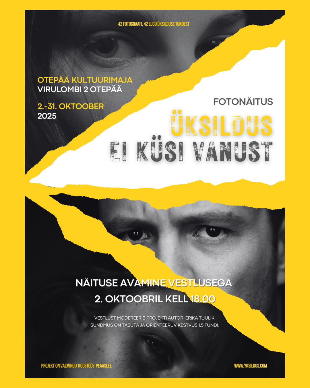 Fotoprojekt “ÜKSILDUS ei küsi vanust” alustas rändava fotonäitusena septembris 2023 ning on eelnevalt külastanud erinevaid Eestimaa paiku (Tallinn, Tartu, Narva, Rakvere, Pärnu, Kuressaare, Haapsalu, Viljandi). Projektis osaleb tänaseks 42 fotograafi, kes toovad vaatajani erinevad vaated üksilduse tundest – seda nii märgates kõrvalseisjana, kui ka jagades isiklikku kogemust. Erinevad fotolood toovad esile meie erisuse tundemaailmas, pakkudes vaatajale kuuluvustunnet ning selle nö. oma loo leidmist. Projekt räägib üksildusest nii visuaalselt läbi fotode, kui ka verbaalselt milleks on foto autorite tekstid.