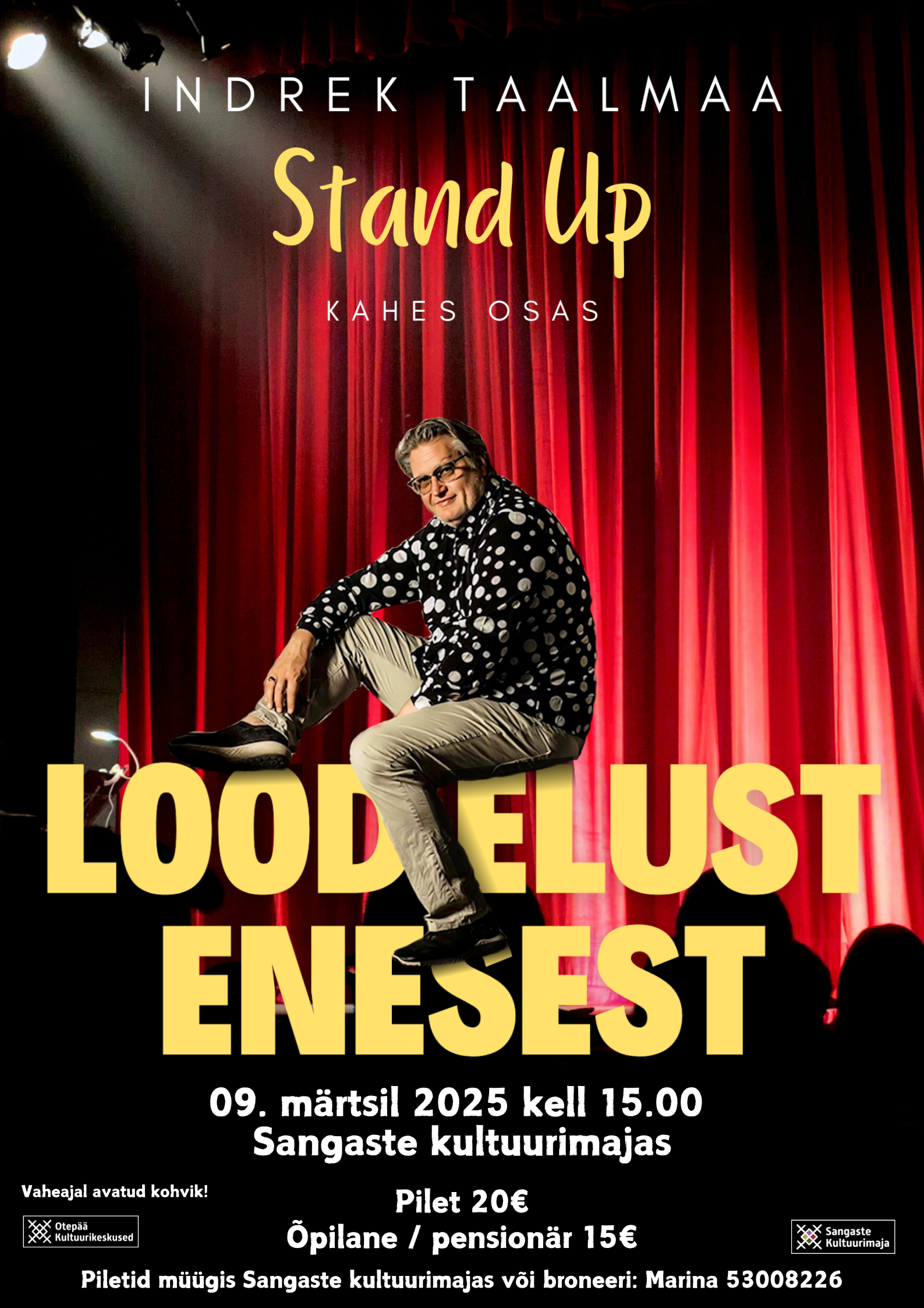 Pileteid saab osta Sangaste kultuurimajast või broneeri: Marina 5300 8226