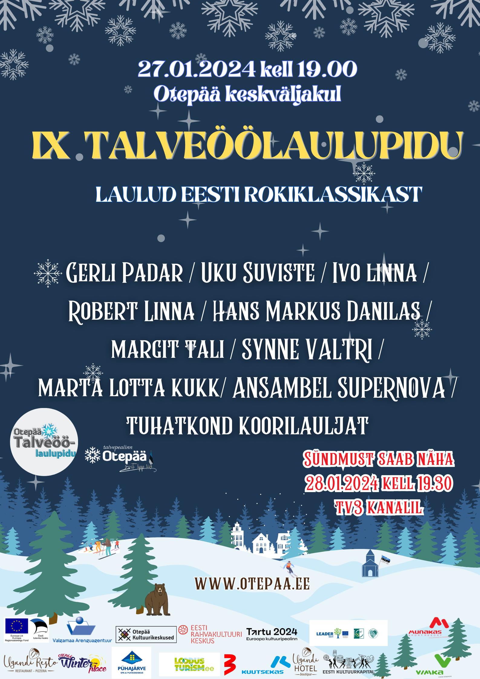 Maagiline talvine muusikasündmus, Otepää Talveöölaulupidu, toimub 27. jaanuaril 2024 kell 19.00 Otepää keskväljakul. Esitamisele tulevad armastatud laulud Eesti rokiklassikast.
