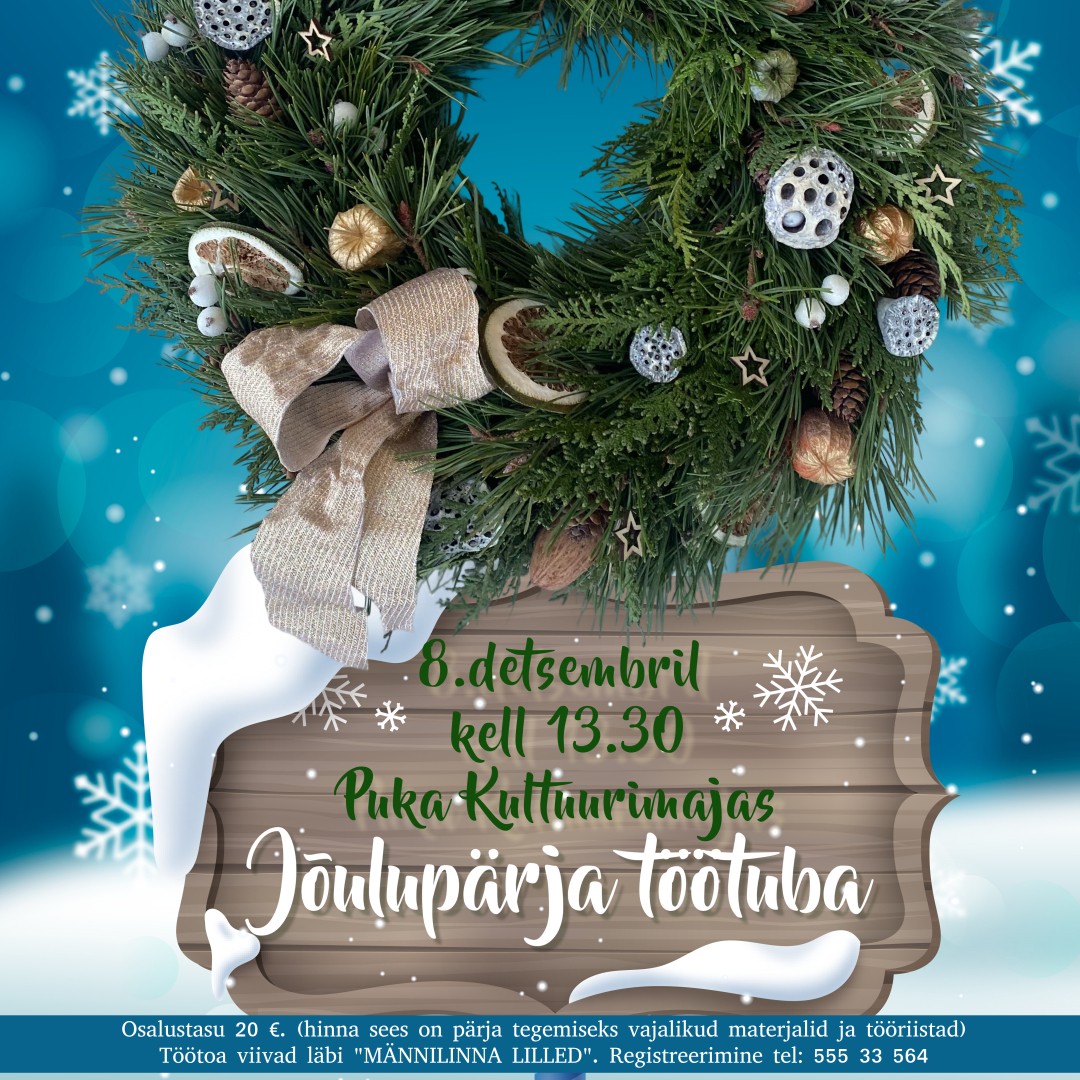 Kell 13.30 Puka Kultuurimaja väikeses saalis toimub JÕULUPÄRJA TÖÖTUBA, kus “MÄNNILINNA LILLED” floristide juhendamisel saad teha omanäolise pärja, mis toob ruumidesse sooja ja piduliku meeleolu.