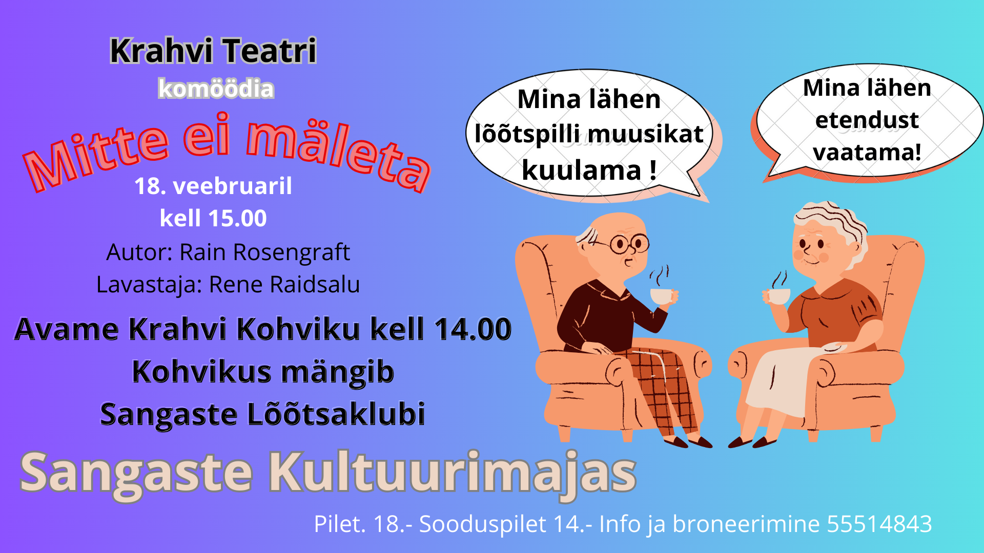 Enne etendust ( kell 14.00 ) ja vaheajal lõõtspillikontsert Sangaste Lõõtsaklubi poolt, Krahvi Kohvikus