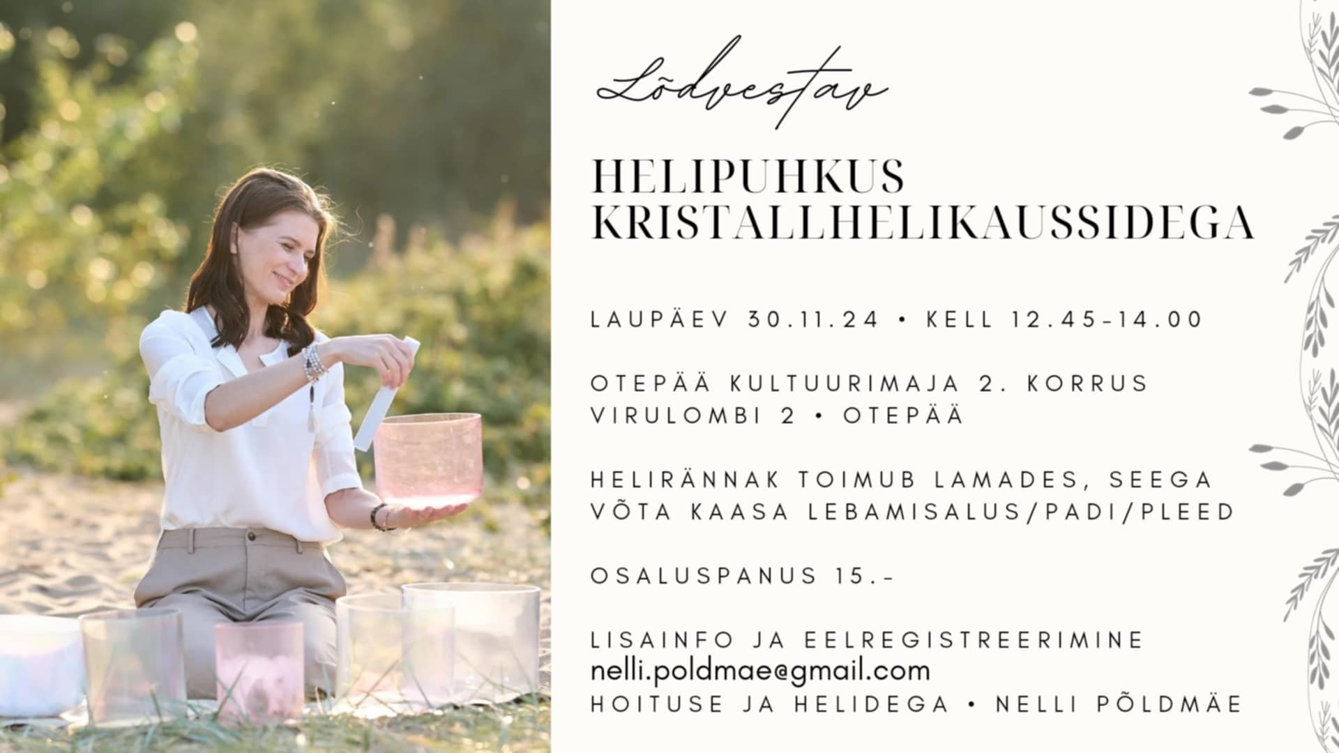 Laupäeval, 30.11.2024 kell 12.45 – 14.00 on võimalik lasta kehal puhata ning nautida vapustavat helirännakut, mida viib läbi imeline NELLI PÕLDMÄE.