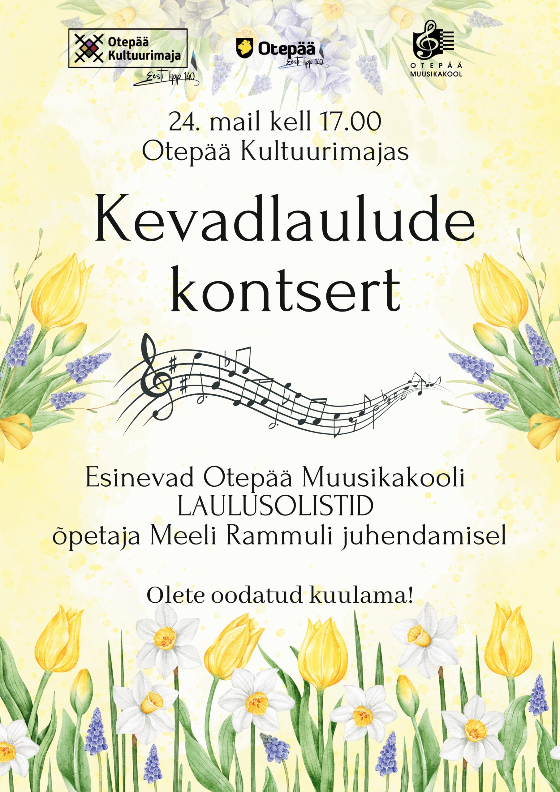 24.mail 2024 kell 17.00 toimub Otepää kultuurimajas Otepää Muusikakooli laulusolistide kevadlaulude kontsert!