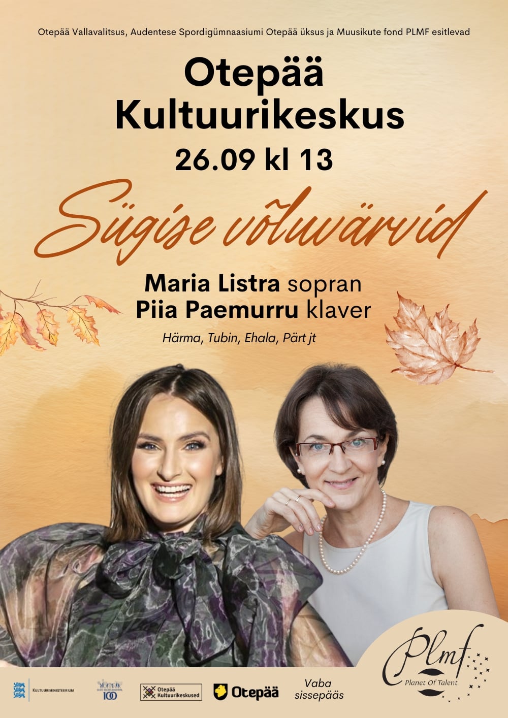 Otepää Vallavalitsus, Audentese Spordigümnaasiumi Otepää üksus ja Pille Lille Muusikute Fond esitlevad: kontsert SÜGISE VÕLUVÄRVID 26. septembril kell 13.00. 🍁