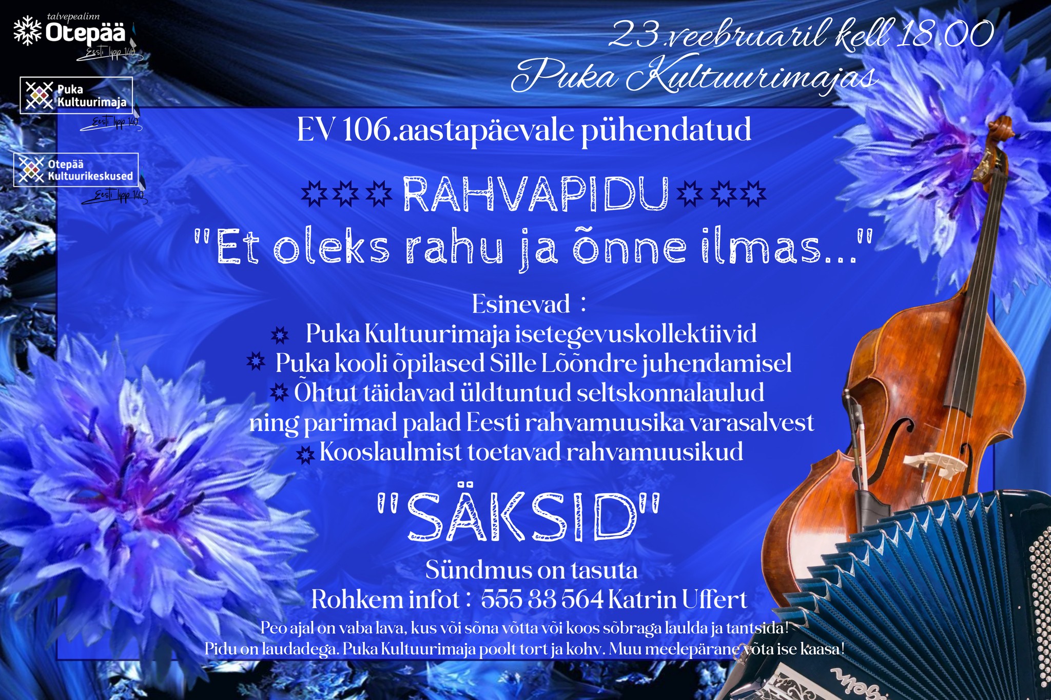 Olete oodatud Eesti Vabariigi 106. aastapäevale pühendatud RAHVAPEOLE.