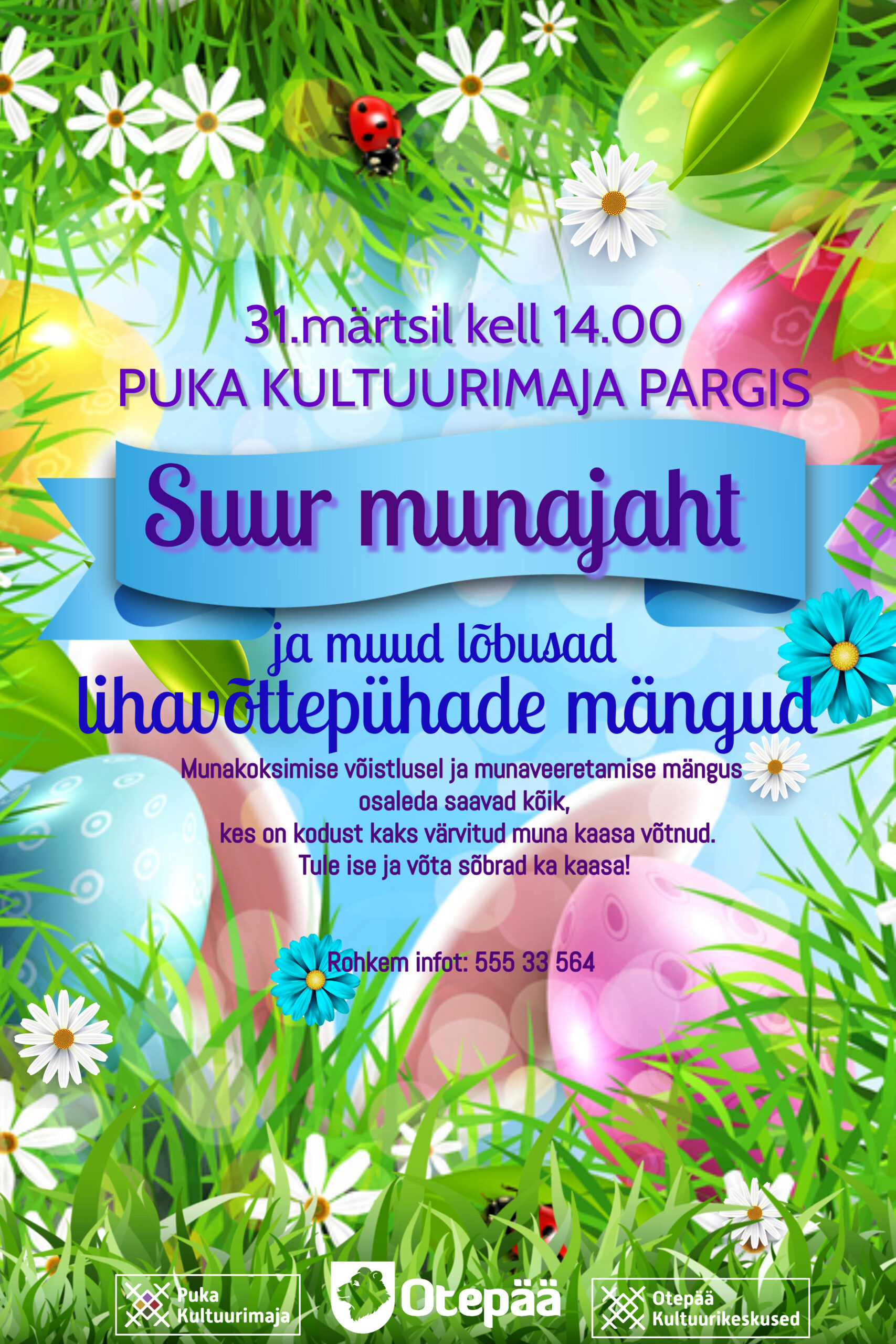 Pühapäeval, 31.03.2024, toimub Puka kultuurimaja pargis Suur MUNAJAHT ja muud lõbusad lihavõttepühade mängud.