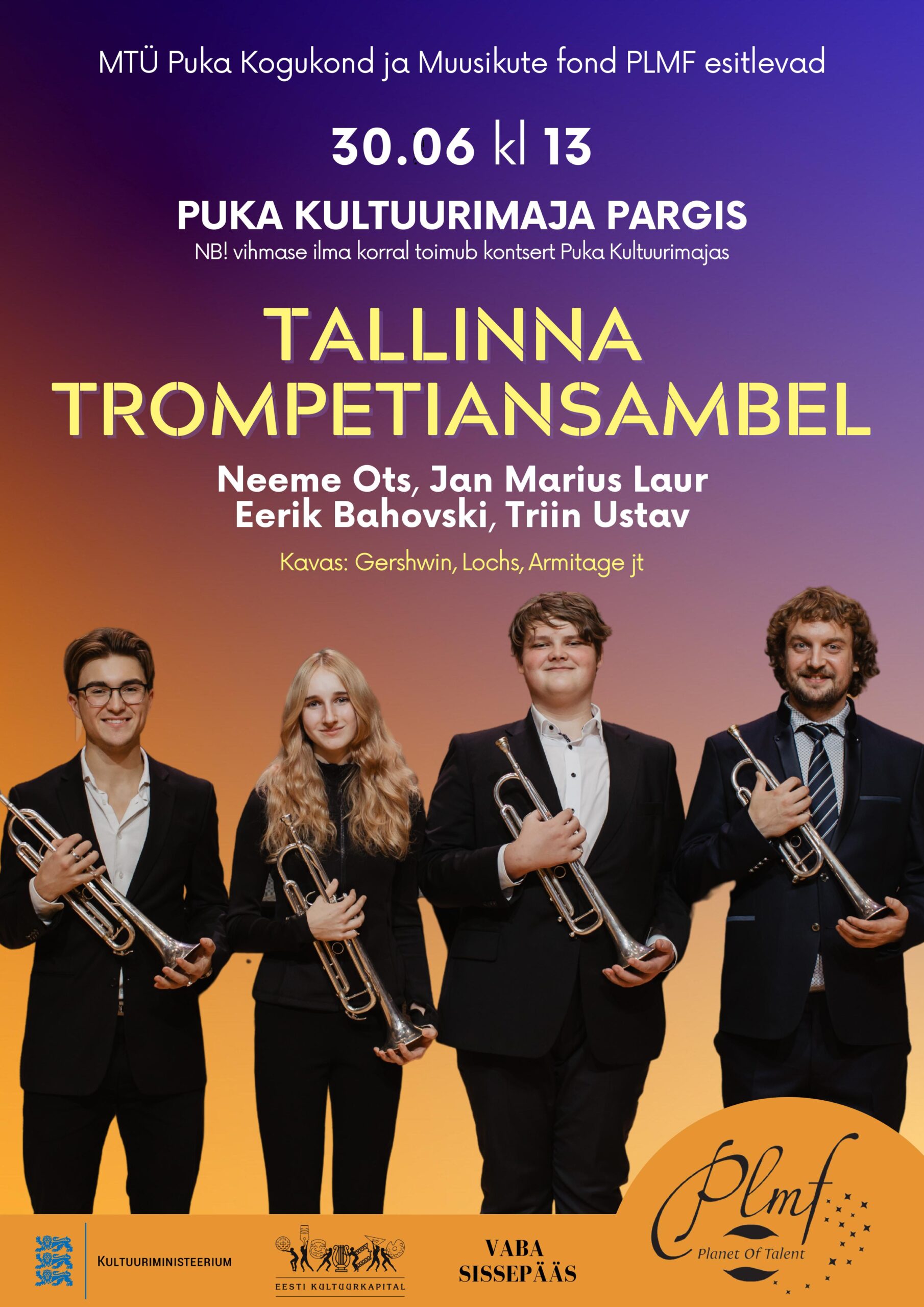 30.06.2024 kell 13.00 ootame kõiki Puka kultuurimaja parki, kus astub üles TALLINNA TROMPETIANSAMBEL koosseisus: Neeme Ots, Jan Marius Laur, Eerik Bahovski ning Triin Ustav