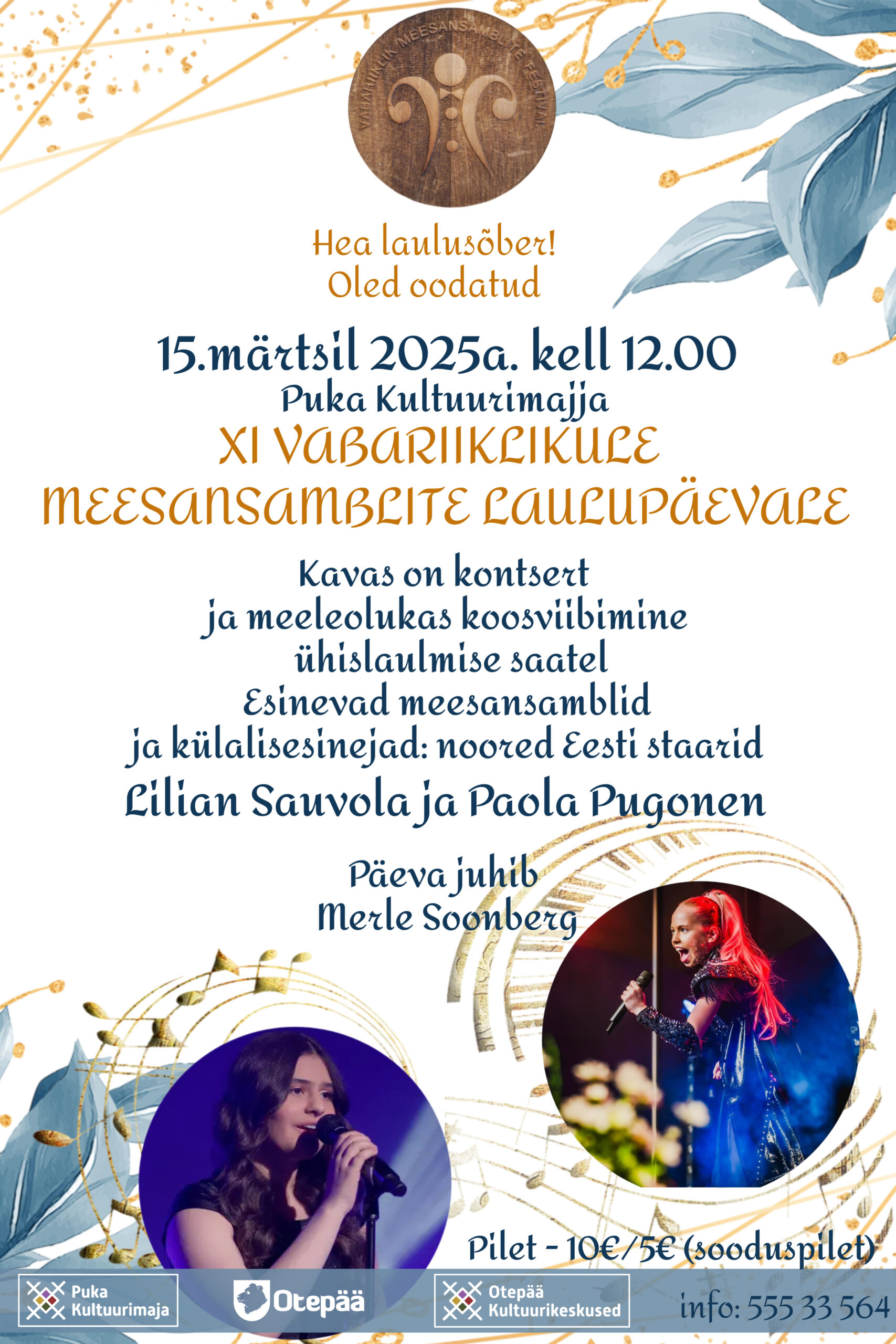 Laupäeval, 15. märtsil kell 12.00 Puka kultuurimajas toimub XI Vabariiklik meesansamblite laulupäev