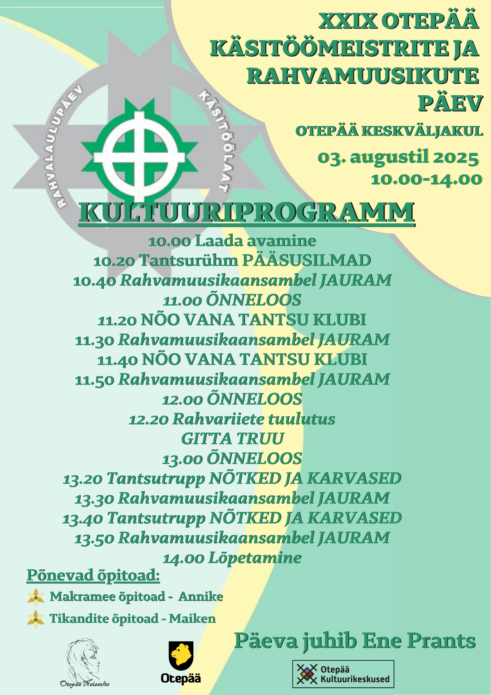 Pühapäeval, 03. augustil kell 10.00-14.00 toimub Otepää keskväljakul traditsiooniline KÄSITÖÖMEISTRITE JA RAHVAMUUSIKUTE PÄEV!